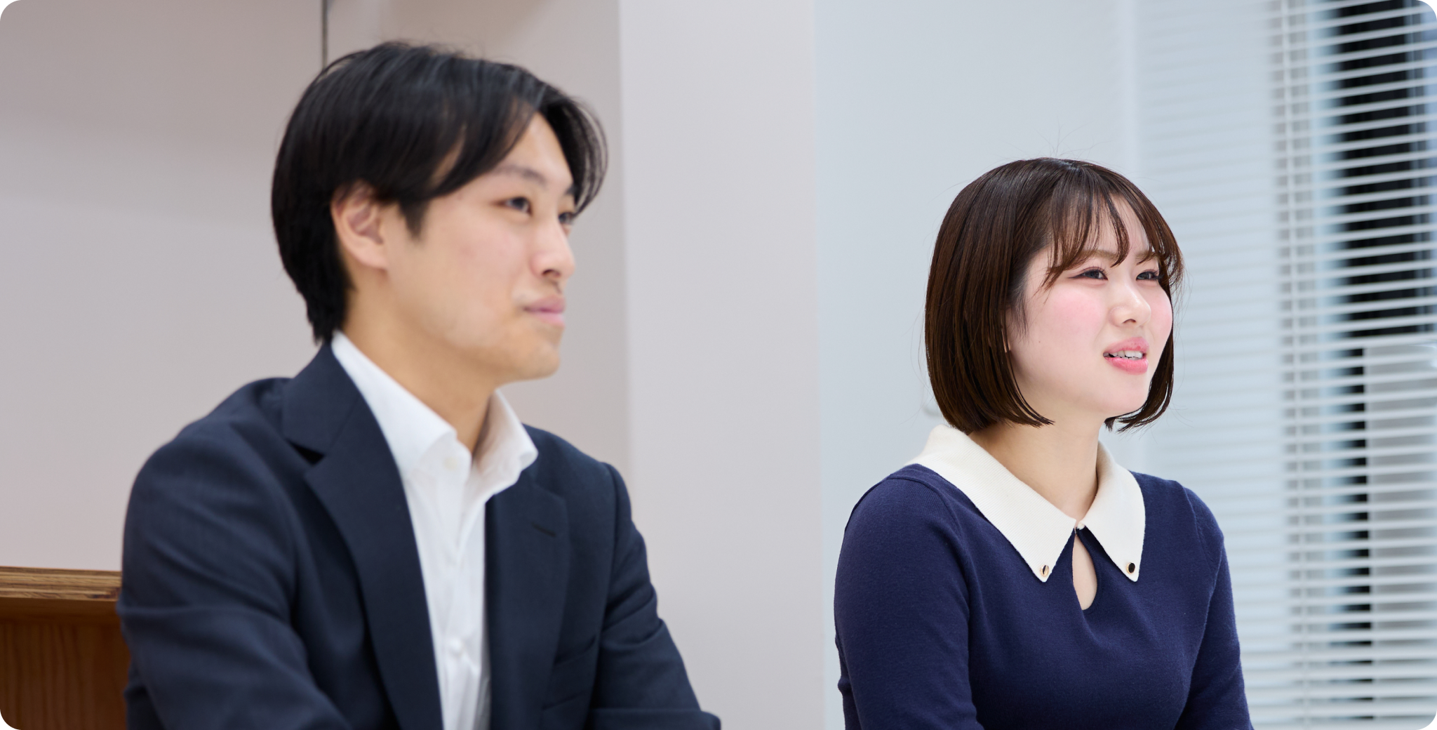 U.T.:私もN.K.さんと同じく営業志望です。現在は業務推進課でオペレーション業務を担当していますが、将来的には営業として国内外で活躍することを目指しています。人事課に仮配属していた経験から、社員全員が活躍できる環境作りに人事部門が尽力していることを実感し、制度面も充実していると感じています。