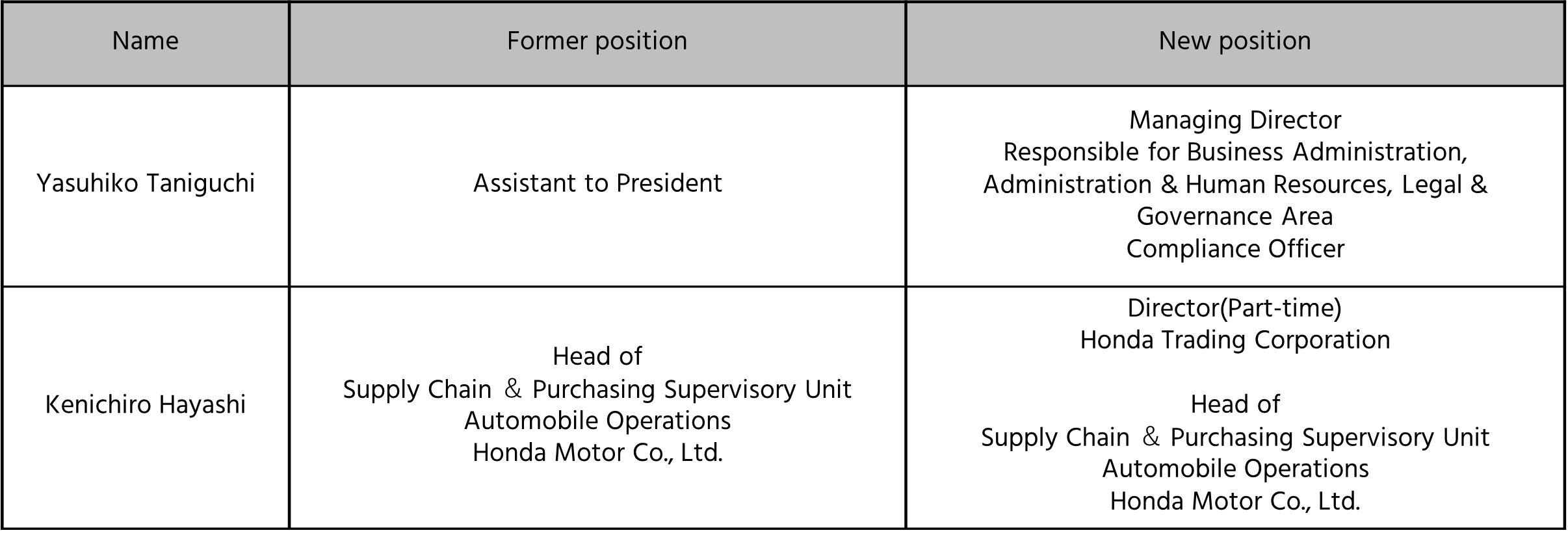 Honda Trading Corporation (the “Company”) hereby announced that the Ordinary General Meeting of Shareholders and the Board of Directors meeting held on June 23, 2022, has decided on changes in its Composition of Directors and Operating Officers on the same day.